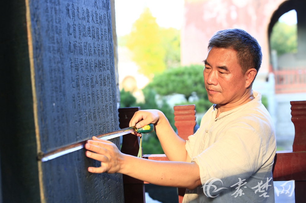(2/4) 专家们对石碑的碑板、碑帽、碑座的长、宽、高、厚以及碑文的大小等都进行了细致测量,并对碑文进行认真辨认、核对、拍照。据悉,该课题项目于2015年6月列入国家社科基金项目。