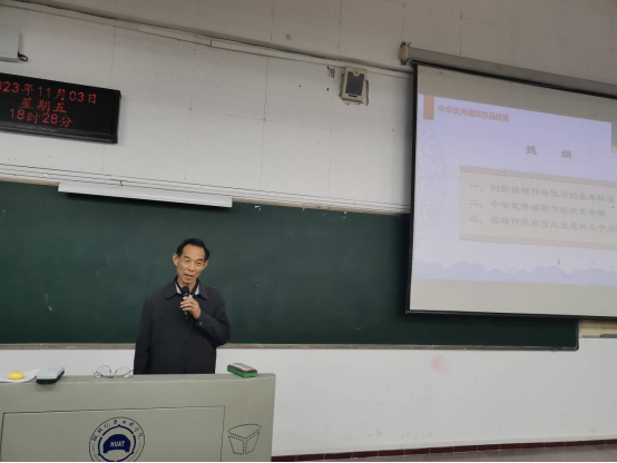 (文/图 安军)11月3日晚上,原市教育局副局长、十堰广播电视大学(教育学院)党委书记,现任十堰市楹联学会会长王学范教授应邀为我校师生做了一场题为《中华优秀楹联作品欣赏》的讲座。